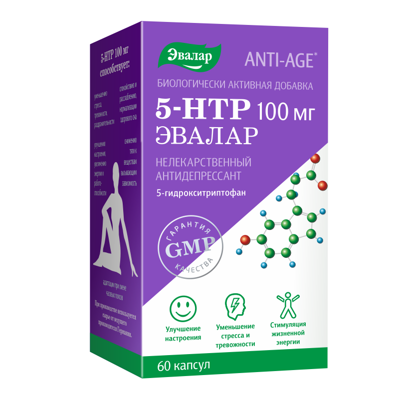 5-гидрокситриптофан (5-НТР) от компании Эвалар – натуральный нелекарственный «антидепрессант», не вызывающий привыкания. В его составе – 5-гидрокситриптофан из стандартизированного немецкого экстракта гриффонии, усиленный витамином В6.