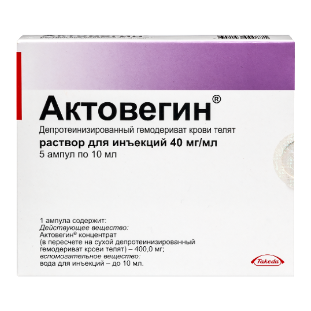 Для ампул объёмом 10 мл: 1 ампула содержит: действующее вещество: Актовегин® концентрат (в пересчёте на сухой депротеинизированный гемодериват крови телят)1) 400,0 мг вспомогательное вещество: вода для инъекций — до 10 мл.