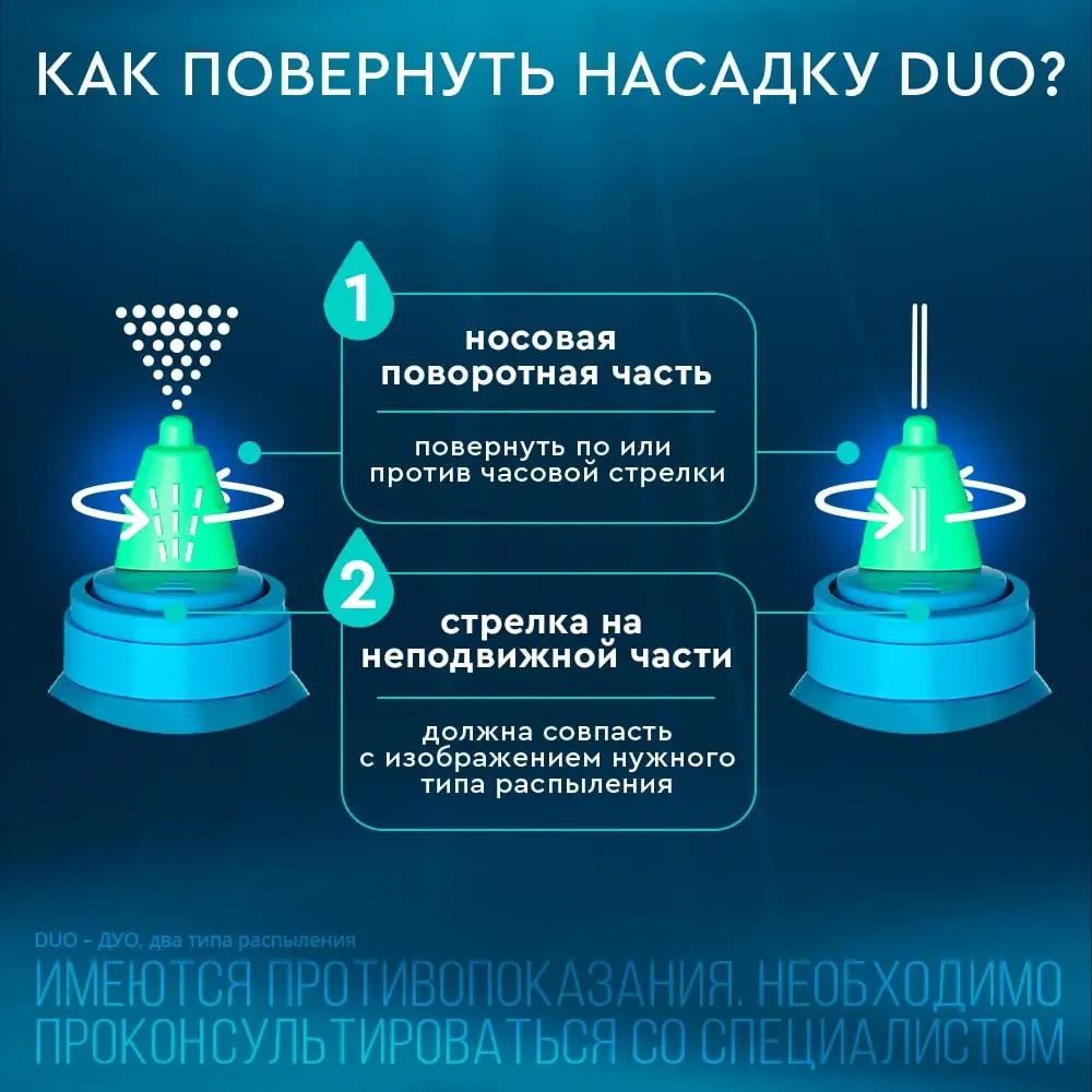 В случае использования средства с поворотной насадкой выберите требуемый тип распыления «душ» или «струя» согласно рекомендациям врача или в зависимости от степени выраженности симптомов, характера выделений и индивидуальных предпочтений. Для выбора варианта «душ» Вам потребуется повернуть по или против часовой стрелки носовую поворотную часть насадки таким образом, чтобы изображение стрелки на неподвижной части насадки совпало с изображением распыления типа «душ» на ее поворотной части. Для выбора варианта «струя» Вам потребуется повернуть по или против часовой стрелки носовую поворотную часть насадки таким образом, чтобы изображение стрелки на неподвижной части насадки совпало с изображением распыления типа «струя» на ее поворотной части (рис.1).