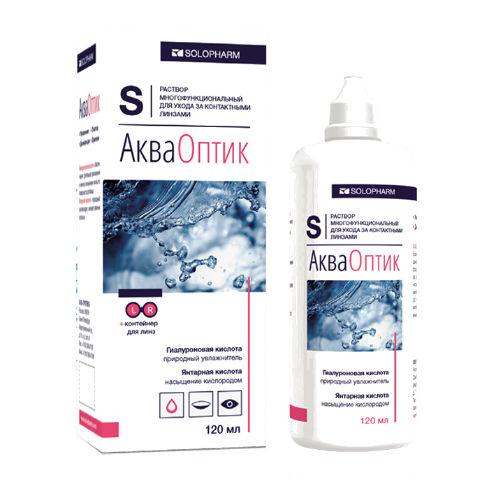 Благодаря специальному увлажняющему комплексу, содержащему природный компонент – натрия гиалуронат (гиалуроновая кислота), раствор АкваОптик обеспечивает мягкое скольжение линзы по поверхности роговицы, длительное оптимальное увлажнение и комфорт. Натрия гиалуронат является физиологическим полисахаридным соединением, содержащимся как в тканях глаза, так и в других тканях и жидкостях организма человека. Особым физико-химическим свойством молекул натрия гиалуроната является их выраженная способность связывать молекулы воды. При применении раствора АкваОптик на поверхности линзы образуется тонкая пленка, предохраняющая глаза от пересыхания и раздражения. Действие защитной пленки начинается практически сразу, тем самым глаза надолго защищены от ощущения сухости. Эффективный очиститель полоксамер 407 связывает протеиновые отложения, препятствуя их образованию на линзах. Входящий в состав раствора АкваОптик полигексаметиленбигуанида гидрохлорид обладает дезинфицирующим действием, защищая глаза и контактные линзы от патогенной микрофлоры. Янтарная кислота обладает выраженным антигипоксическим и антиоксидантным действием, в растворе АкваОптик янтарная кислота снижает риск развития гипоксических осложнений, связанных с ношением контактных линз. Трегалоза является веществом природного происхождения, встречающимся в самых разнообразных организмах. Особенность трегалозы состоит в способности к защитной роли в отношении клеточных мембран в ангидробиотическом механизме растений и микроорганизмов (состояние замедленного метаболизма, которое позволяет им выживать в условиях обезвоживания). Благодаря своим физико-химическим характеристикам, трегалоза дополняет увлажняющие, антиоксидантные и защитные свойства раствора.