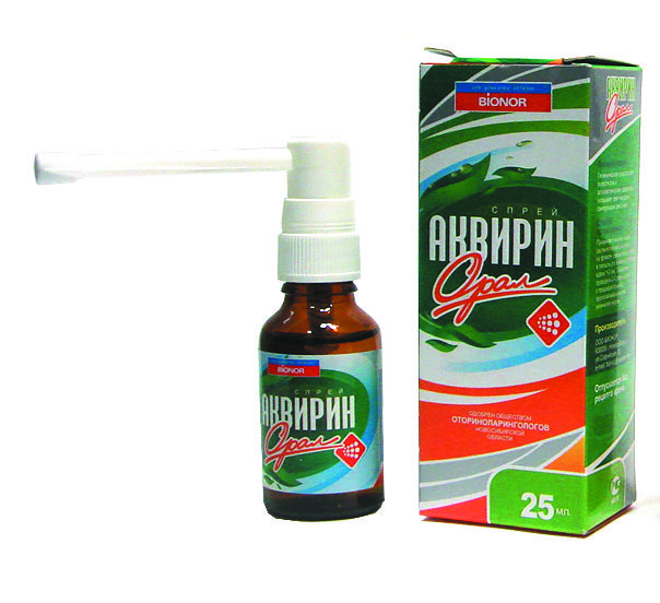 Противомикробный и антисептический препарат широкого спектра действия для местного применения. Аквирин орал обладает противовоспалительным, противоотечным действием на слизистую оболочку, антибактериальным действием на большинство грамположительных и грамотрицательных микроорганизмов, вызывающих инфекционно- воспалительные заболевания ЛОР - органов и слизистой оболочки полости рта.