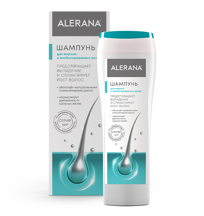 Шампунь на основе натуральных стимуляторов роста волос ALERANA разработан для бережного ухода и сбалансированного очищения жирных и комбинированных волос, имеющих склонность к выпадению.