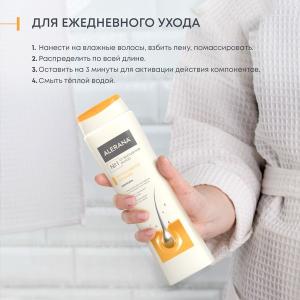 Небольшое количество шампуня нанести на влажные волосы, взбить пену, помассировать, оставить на 1-3 минуты, затем смыть теплой водой. Для достижения наилучшего эффекта после применения шампуня рекомендуется использовать бальзам-ополаскиватель ALERANA.