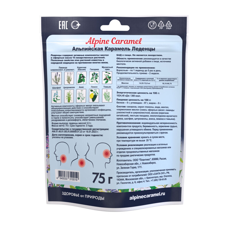 Леденцы Alpine Caramel Альпийская Карамель содержат кармоловое масло (уникальный комплекс эфирных масел 10 лекарственных растений) и ментол. Полезные свойства этих лекарственных растений известны на протяжении многих веков. Состав проверен временем и подбирался с учетом синергии компонентов, когда в комплексе они дополняют и усиливают действие друг друга. Активные компоненты кармолового масла способствуют повышению сопротивляемости организма к инфекциям, улучшают общее самочувствие. Комплекс эфирных масел обладает антисептическим, противомикробным, противовирусным, иммуностимулирующим и мягким гармонизирующим действием на нервную систему. Компоненты эфирных масел лекарственных растений улучшают отхождение мокроты, стимулируют пищеварение, улучшают общее состояние организма.