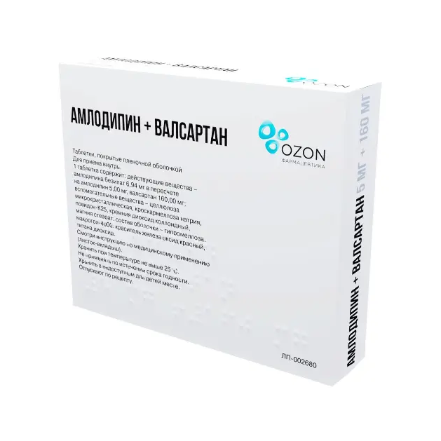 Активные вещества: амлодипина безилат — 6,94 мг в пересчёте на амлодипин — 5,00 мг, валсартан — 160,00 мг.