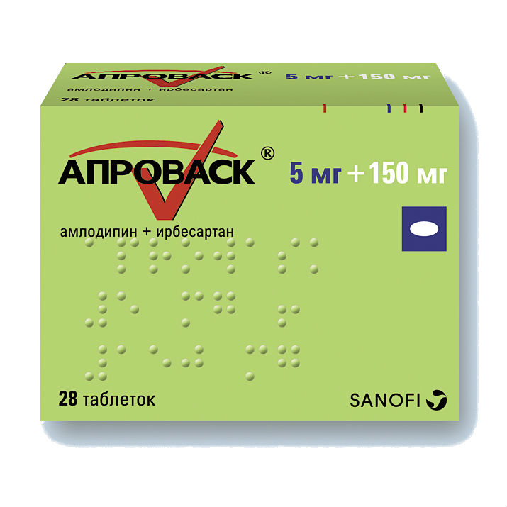 Фармакодинамические свойства каждого из активных веществ, входящих в состав препарата Апроваск®, ирбесартана и амлодипина, способствуют их аддитивному антигипертензивному действию при применении в комбинации по сравнению таковым при применении каждого этих препаратов в отдельности. Как антагонисты рецепторов ангиотензина II (АРА11), так и блокаторы «медленных» кальциевых каналов, снижают артериальное давление (АД) за счёт снижения периферического сопротивления сосудов, блокада поступления кальция в клетку и уменьшение обусловленного воздействием ангиотензина II сосудосуживающего действия являются дополняющими друг друга механизмами.