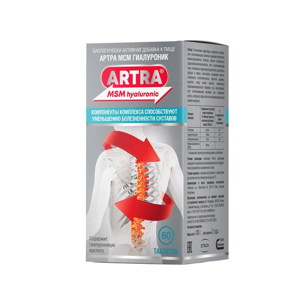 БИОЛОГИЧЕСКИ АКТИВНАЯ ДОБАВКА К ПИЩЕ АРТРА МСМ ГИАЛУРОНИК (далее АРТРА МСМ ГИАЛУРОНИК) содержит высокие концентрации глюкозамина, хондроитина, гиалуроновой кислоты и метилсульфонилметана (МСМ), которые в комбинации обладают синергическим эффектом, дополняя и усиливая эффекты друг друга. Хондроитин и глюкозамин играют важнейшую роль в восстановлении соединительной ткани, улучшают амортизационные свойства хряща, увеличивают подвижность суставов.