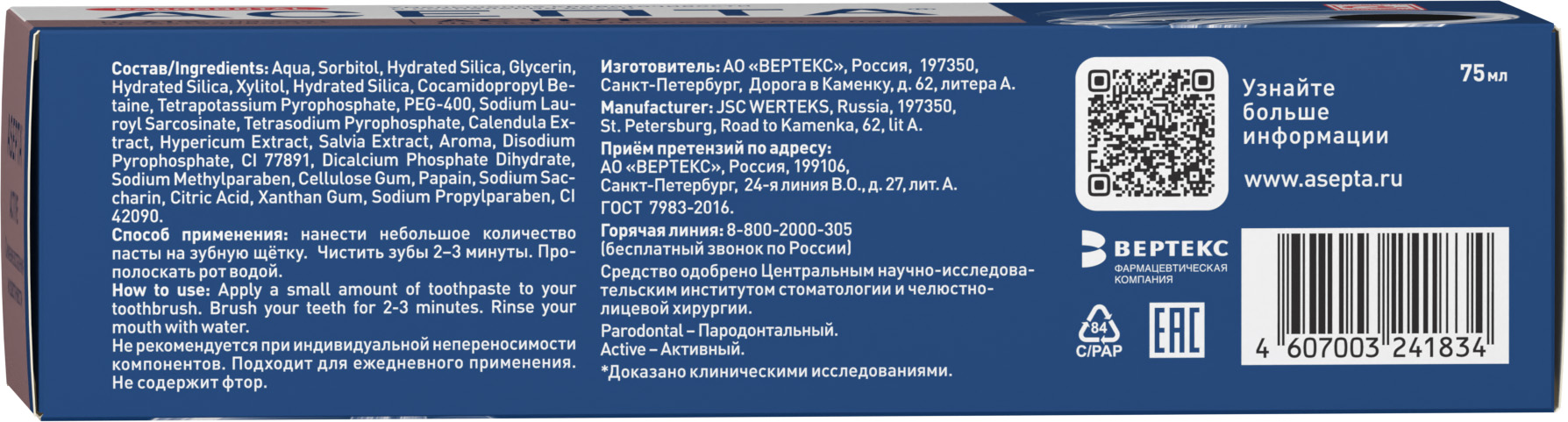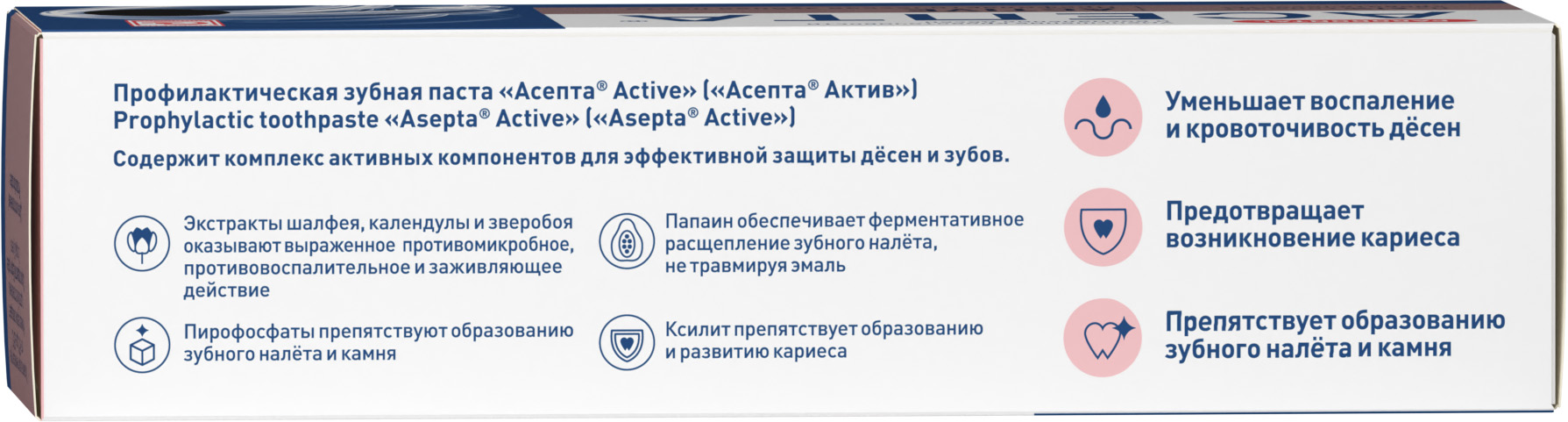 Профилактическая зубная паста АСЕПТА® предназначен для комплексного ухода за полостью рта и защиты десен от воспаления.Показания к применению
