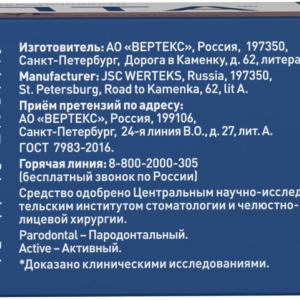 Вода, кремния диоксид, сорбит, глицерин, ксилит, кокамидопропилбетаин, тетракалия пирофосфат, ПЭГ-400, натрия лауроилсаркозинат, тетранатрия пирофосфат, календулы экстракт, зверобоя экстракт, шалфея экстракт, ароматизатор, динатрия пирофосфат, титана диоксид, дикальций фосфат дигидрат, натрия метилпарабен, натрия карбоксиметилцеллюлоза, папаин, натрия сахаринат, лимонная кислота, ксантановая камедь, натрия пропилпарабен, краситель синий блестящий.