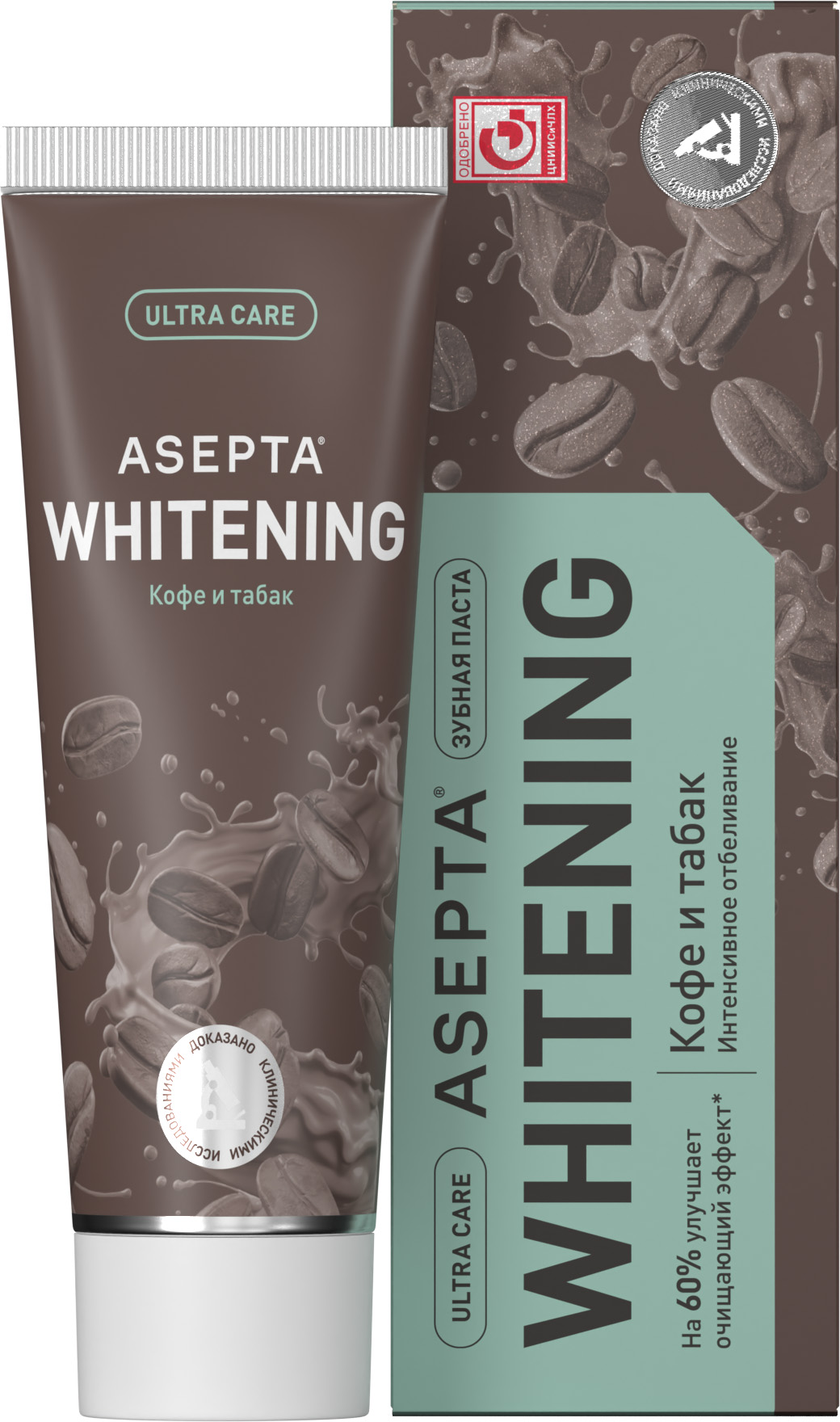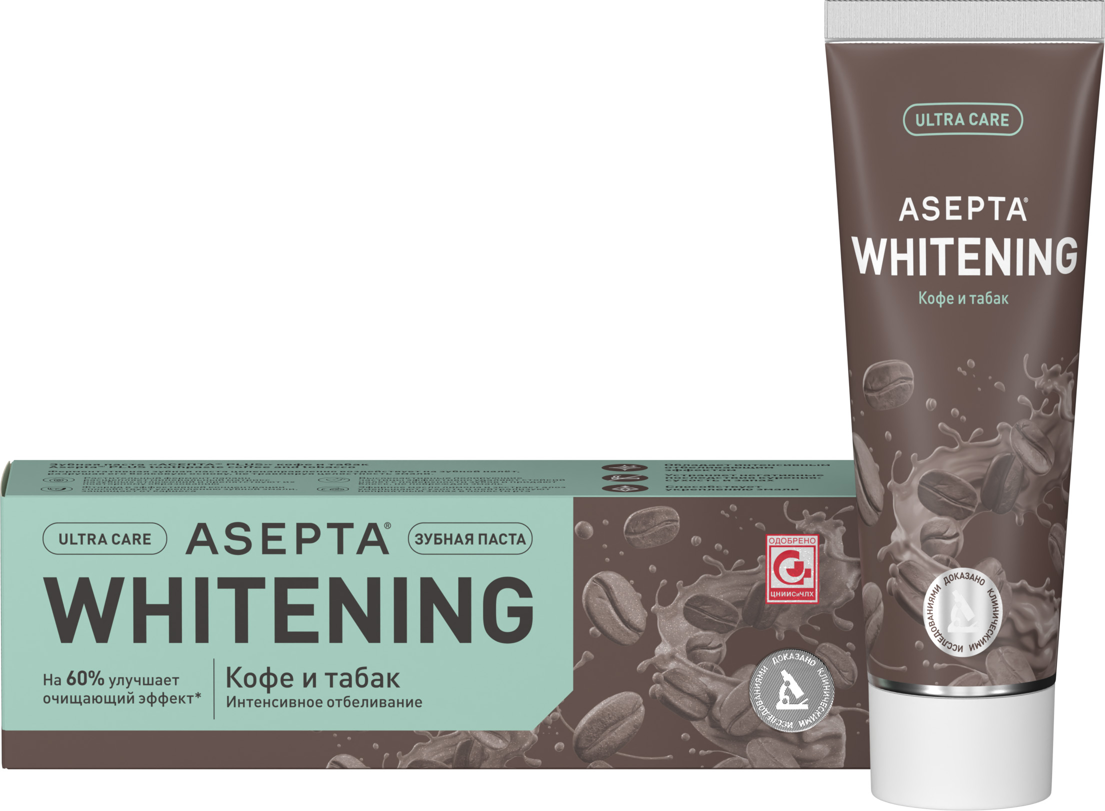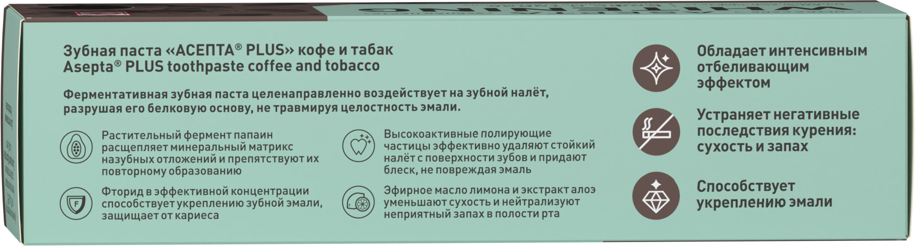 Белые зубы и здоровая слизистая без сухости и воспаления теперь доступны самому широкому кругу любителей кофе, чая, табака и красного вина. Зубная пасте Асепта Plus Кофе и табак заботится о здоровье десен и эффективно осветляет эмаль зубов каждый день, поэтому даже при регулярном употреблении красящих продуктов зубы сохраняют привлекательный природный оттенок, а слизистая полости рта восстанавливается быстрее и не страдает от сухости.