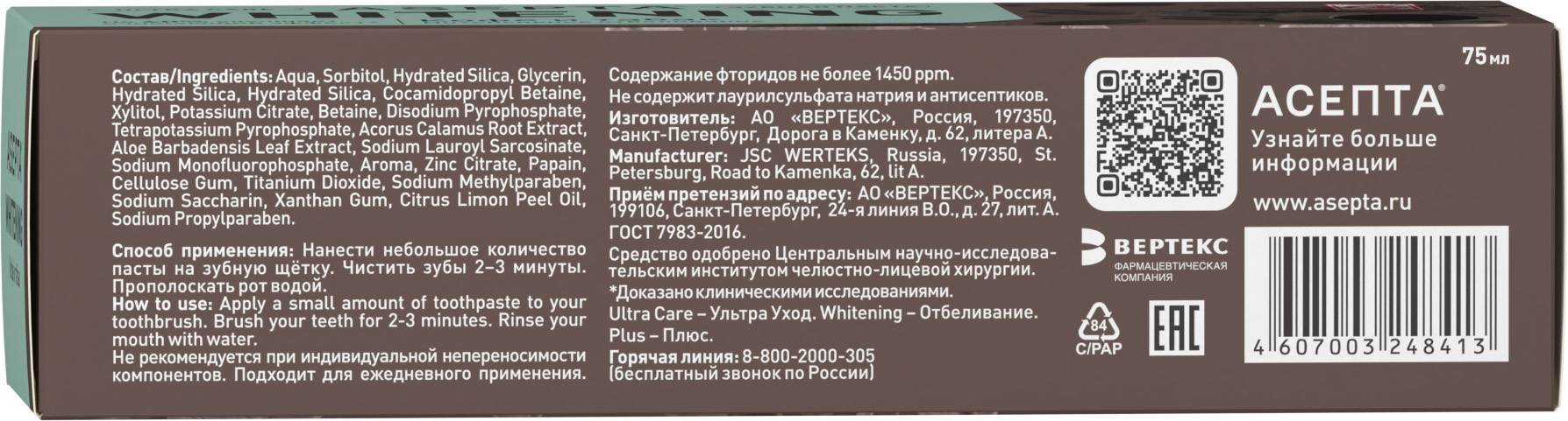 Асепта Плюс Кофе и табак профессиональная зубная паста туба 75мл