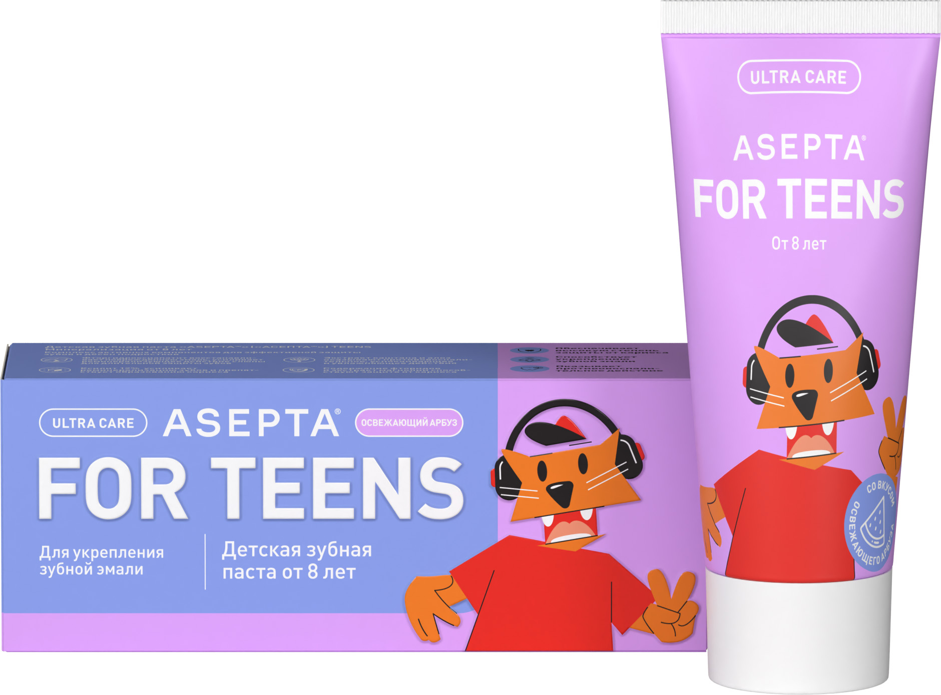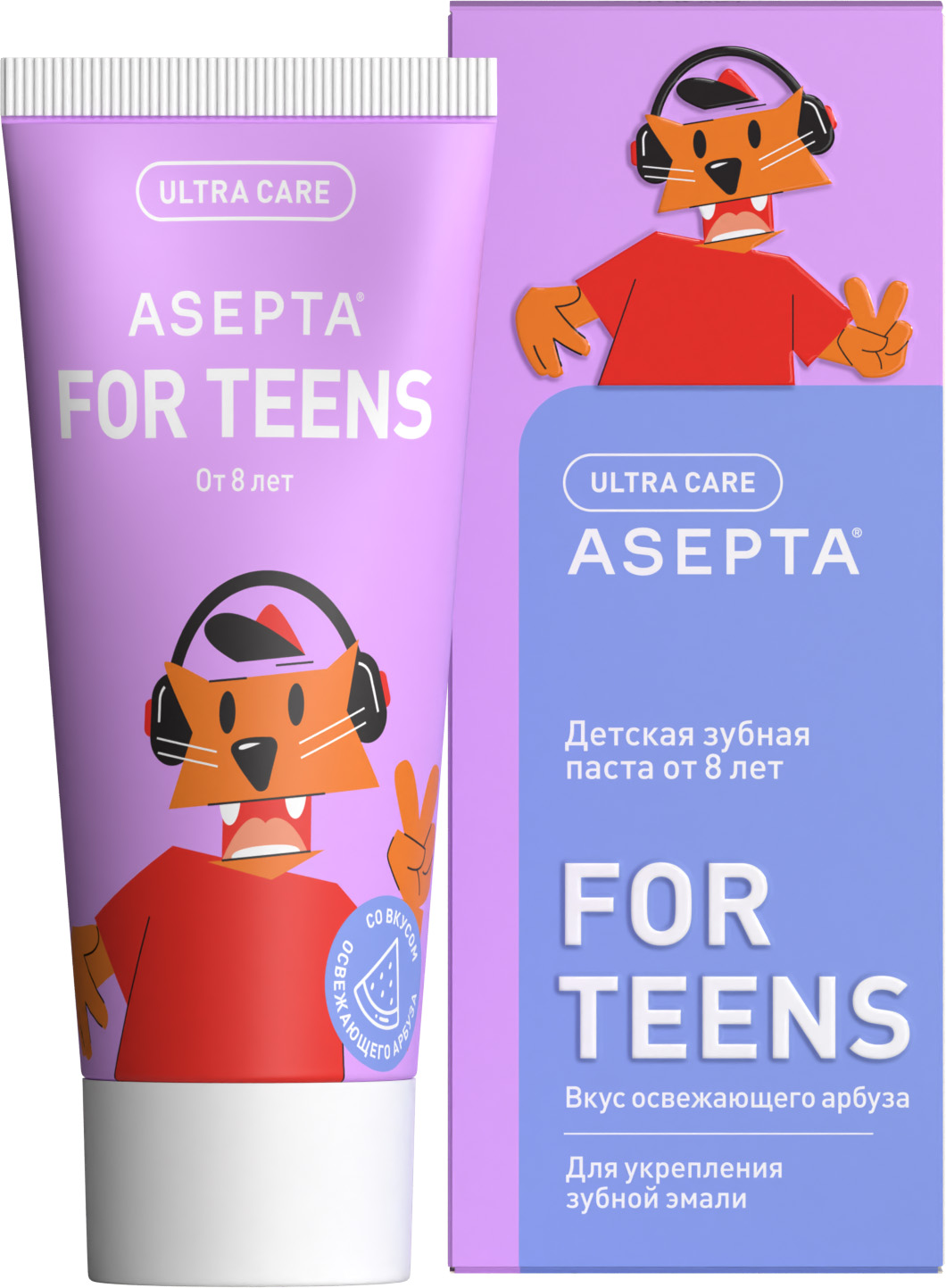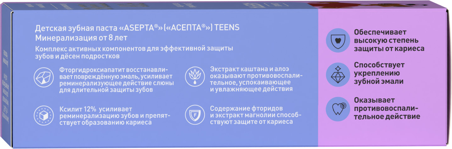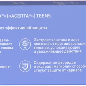 - ASEPTA TEENS Минерализация — это зубная паста с ярким вкусом освежающего арбуза и комплексом активных компонентов для реминерализации хрупкой эмали у подростков и детей от 8 лет.