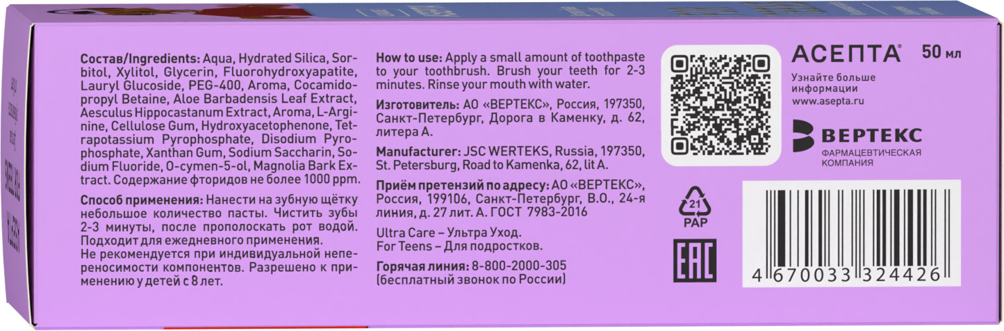 - Зубные пасты ASEPTA произведены фармацевтической компанией с соблюдением международных стандартов качества.