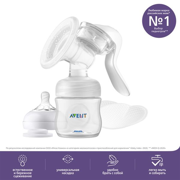АВЕНТ МОЛОКООТСОС РУЧНОЙ SCF430/10 - разработан с учетом понимания принципов сосания ребенка, размеров и форм груди, поэтому обеспечивает естественное и бережное сцеживание. Универсальная насадка молокоотсоса адаптируется под любую форму и размер соска и подходит 99% мам.