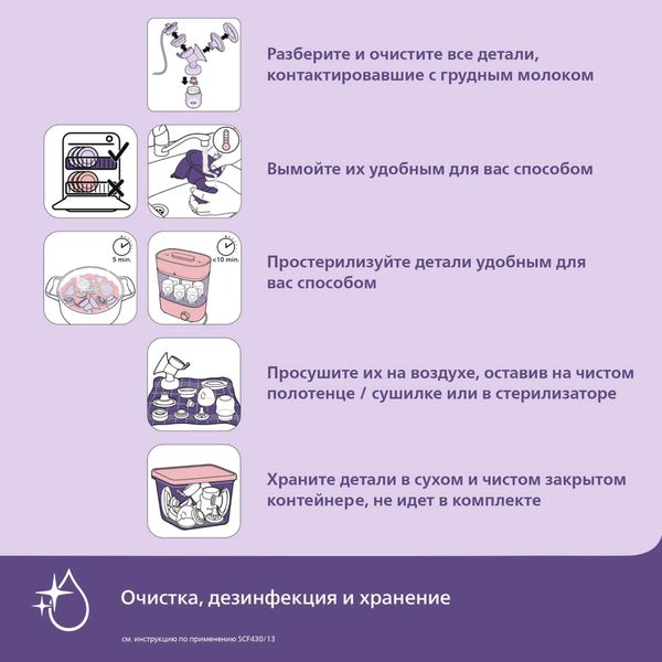Легко мыть и собирать - небольшое количество деталей молокоотсоса позволяют без труда собирать и очищать молокоотсос.