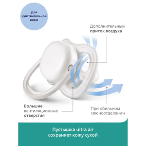 Успокойте своего малыша с помощью пустышки, которая позволяет коже дышать. Пустышка из коллекции Philips Avent ultra air имеет большие вентиляционные отверстия, поддерживающие сухость кожи. Легкий нагубник обеспечивает максимальный поток воздуха. Доступно несколько вариантов расцветки.