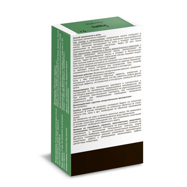 При радикулитах, невралгии и болях ревматического характера: к порошку добавляют растительное масло, размешивают до получения сметанообразной массы и втирают в болезненные участки. Через 20 мин после подсыхания состав смывают водой. При сильном жжении состав смыть водой!