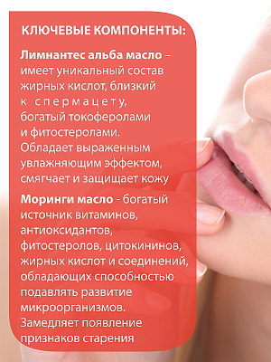 - Лимнантес альба масло – имеет уникальный состав жирных кислот, близкий к с п е р м а ц е т у, богатый токоферолами и фитостеролами. Обладает выраженным увлажняющим эффектом, смягчает и защищает кожу. Способствует восстановлению гидролипидного защитного слоя.