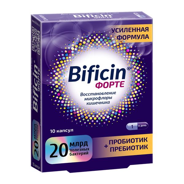 Бифицин Форте - биологически активная добавка (БАД) к пище, синбиотик. 10 культур полезных бактерий, 20 миллиардов КОЕ в 1 капсуле. Усиленная формула, способствующая ускоренному восстановлению организма после приема антибиотиков или при расстройствах желудочно-кишечного тракта.