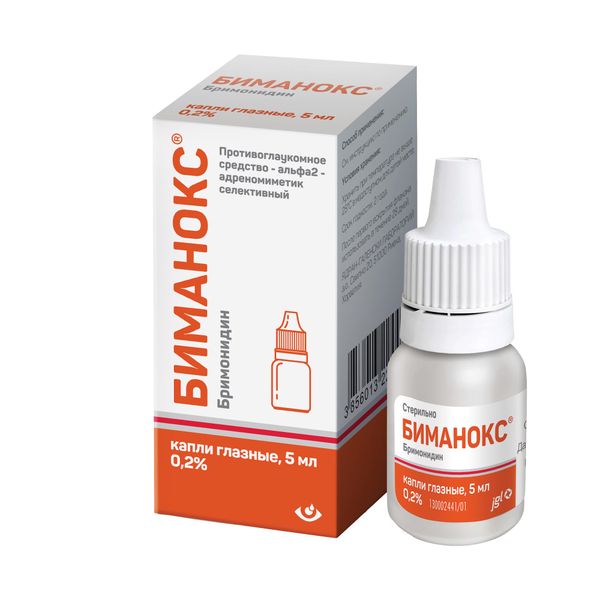 Бримонидин — селективный альфа2-адреномиметик, оказывающий стимулирующее действие на альфа2-адренорецепторы. Гипотензивное действие бримонидина обеспечивается за счёт снижения образования и повышения оттока внутриглазной жидкости по увеосклеральному пути. При применении Биманокса®, капли глазные, 0,2 %, максимальное снижение внутриглазного давления достигается через 2 часа.