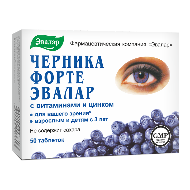 Черника-форте с витаминами и цинком – комплекс витаминов для зрения с антоцианами черники, витаминами и цинком, необходимыми для ежедневного поддержания зрения, особенно при повышенных нагрузках на глаза. Биологически активные вещества черники (антоцианы, органические кислоты, каротины, пектиновые вещества, микроэлементы), действующие в комплексе с витаминами группы В, витамином С, рутином и цинком: