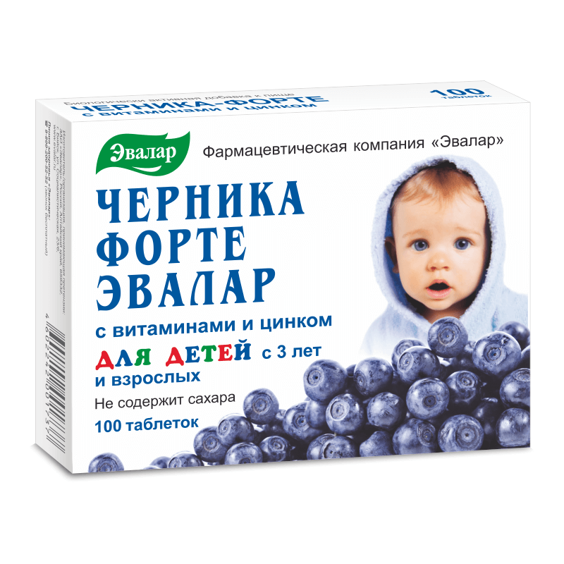 Черника-форте с витаминами и цинком – комплекс витаминов для зрения с антоцианами черники, витаминами и цинком, необходимыми для ежедневного поддержания зрения, особенно при повышенных нагрузках на глаза. Биологически активные вещества черники (антоцианы, органические кислоты, каротины, пектиновые вещества, микроэлементы), действующие в комплексе с витаминами группы В, витамином С, рутином и цинком: