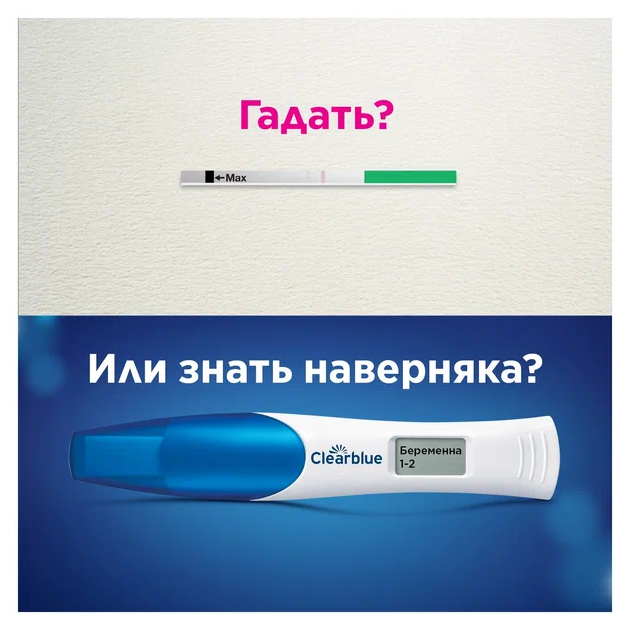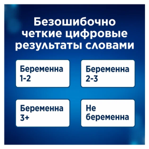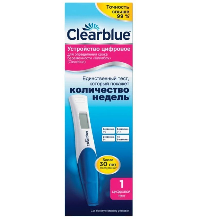 Устройство цифровое для определения срока беременности «Клиаблу» (Clearblue) — это первый и единственный тест, такой же точный в определении срока беременности, как ультразвуковое исследование (1). Его интеллектуальный двойной датчик не только показывает вам словами на цифровом дисплее, беременны вы или нет, но и то, какой у вас срок: количество недель с момента зачатия отображается как 1–2, 2–3 или 3+. (2) С помощью этого теста на беременность можно делать тест за 5 дней до задержки месячных (то есть за 4 дня до ожидаемого начала менструации). 65 % случаев результатов «Беременна» можно обнаружить уже за 5 дней до задержки месячных.