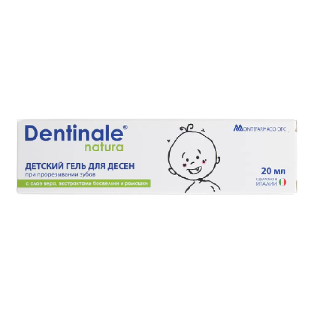 Действующие вещества геля Dentinale® natura — натуральные компоненты: алоэ вера, экстракты босвеллии и ромашки, которые оказывают противовоспалительное, антисептическое и ранозаживляющее действие. Dentinale® natura безвреден при проглатывании, имеет приятный вкус, не содержит сахар, парабены и синтетические обезболивающие вещества (лидокаин и пр.).