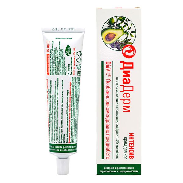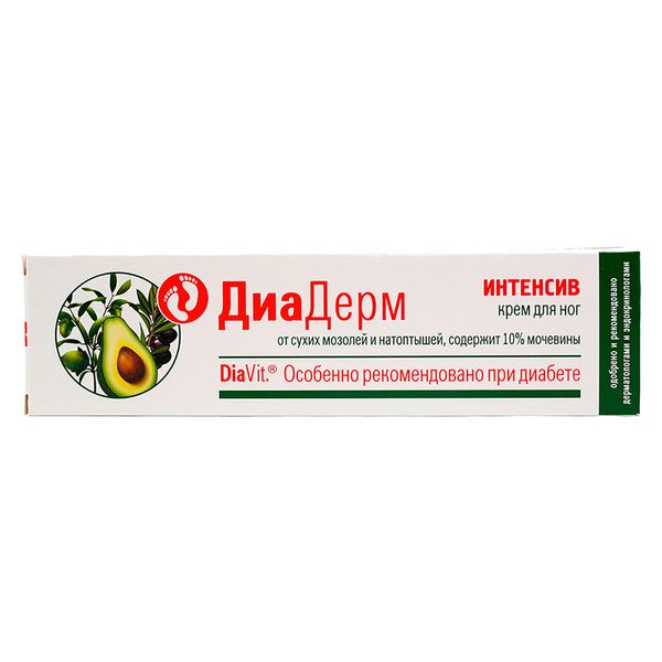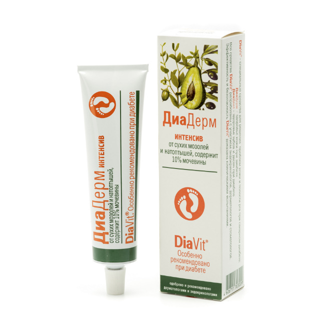 Крем для ног ДиаДерм Интенсив особенно рекомендован для людей с диабетом. Крем ДиаДерм Интенсив отличается повышенным содержанием мочевины (10%), что обеспечивает эффективное и безопасное устранение сухих мозолей и «натоптышей».