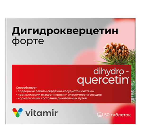 «Дигидрокверцетин Форте ВИТАМИР®» — биологически активная добавка к пище, содержащая в 2,5 раза больше дигидрокверцетина по сравнению с комплексом «Дигидрокверцетин ВИТАМИР®». Ее компоненты обладают антиоксидантными свойствами, способствуют защите организма от повреждающего действия свободных радикалов и улучшению состояния сердечно-сосудистой системы.