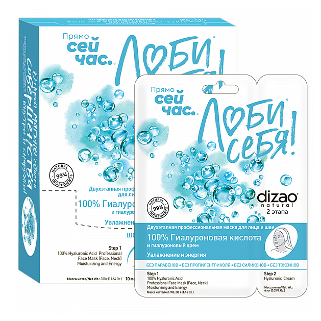Dizao Маска для лица, шеи, век 100% гиалуроновая кислота, двухэтапная, упаковка (10 саше).