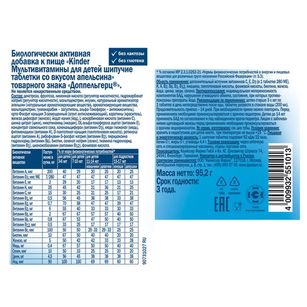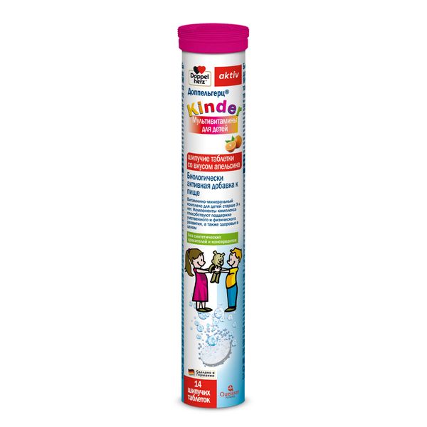 Биологически активная добавка к пище "KinderМультивитамины Доппельгерц" для детей, шипучие таблетки со вкусом апельсина.