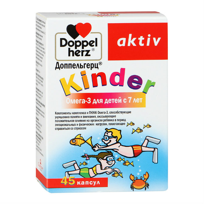Доппельгерц® Kinder Омега-3 для детей с 7 лет. Компоненты комплекса и ПНЖК Омега-3, способствующие улучшению памяти и внимания, оказывающие положительное влияние на организм ребенка в период эмоциональных и физических нагрузок, помогающие справиться со стрессом.