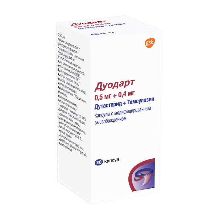 Препарат Дуодарт представляет собой комбинацию двух компонентов с взаимодополняющими механизмами действия, способствующих устранению симптомов у пациентов с доброкачественной гиперплазией предстательной железы (ДГПЖ): двойного ингибитора 5α-редуктазы — дутастерида и блокатора α1а-адренорецепторов — тамсулозина гидрохлорида.