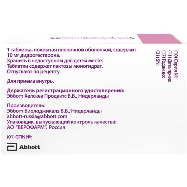 Возможно прерывание беременности на раннем сроке (особенно до 10 нед беременности) — частота развития беременности при проведении процедур вспомогательных репродуктивных технологий (ВРТ) в среднем составляет около 35%. Профиль безопасности, наблюдавшийся в данном исследовании, соответствует ожидаемому, с учетом хорошо изученного профиля безопасности дидрогестерона и популяции пациенток.