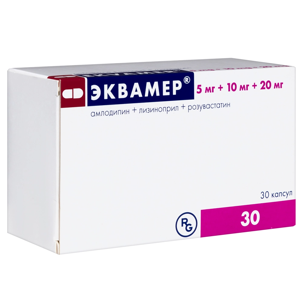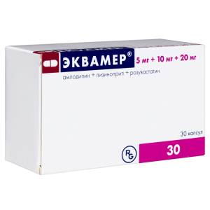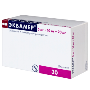 Эквамер® — комбинированный гипотензивный и гиполипидемический препарат. В состав препарата Эквамер® входят три действующих вещества — амлодипин, лизиноприл и розувастатин. Механизм действия препарата Эквамер® основан на фармакологических свойствах действующих веществ.