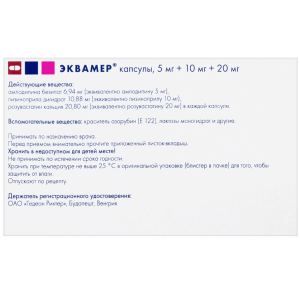 Препарат Эквамер® дозировкой 5 мг + 10 мг + 10 мг и дозировкой 10 мг + 20 мг + 10 мг содержит 48,10 мг лактозы моногидрата в каждой капсуле. Препарат Эквамер® дозировкой 5 мг + 10 мг + 20 мг и дозировкой 10 мг + 20 мг + 20 мг содержит 96,20 мг лактозы моногидрата в каждой капсуле.