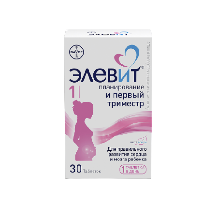 Элевит® 1 - Элевит® Планирование и Первый Триместр БАД к пище. Рекомендован для применения с первого дня беременности и до начала 2-го триместра. Содержит специальную форму фолатов – Метафолин®, 11 витаминов и 8 микроэлементов, включая йод и железо. Способствует правильному развитию сердца и мозга ребенка.