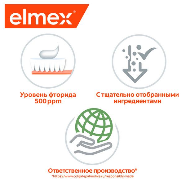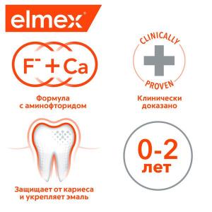 Еlmex детская зубная паста для детей с первого зуба до 2 лет разработана для ежедневного ухода и защиты мягкой, не полностью сформировавшейся эмали молочных зубов. Обладает приятным, мягким, но не сладким вкусом, что не провоцирует ребенка к проглатыванию зубной пасты. Применение детской зубной пасты с фтором защищает от кариеса. Детская зубная паста elmex содержит эффективный аминофторид в концентрации, рекомендованной стоматологами для детей (500 ppm).