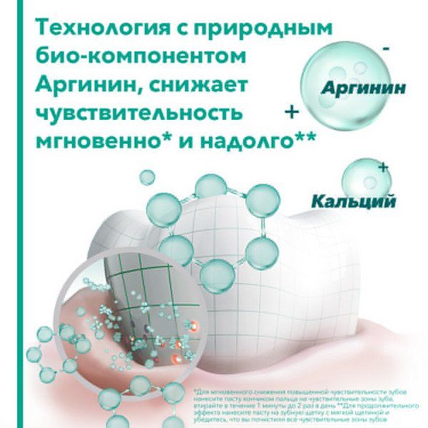Основу зубной пасты составляет технология PRO-ARGIN в состав которой входит аргинин — натуральная аминокислота, поддерживающая действие активных ингредиентов. Эксклюзивная формула закрывает открытые дентинные канальцы, блокируя болезненные ощущения. Монофторфосфат натрия обеспечивает защиту от кариеса и укрепляет эмаль.