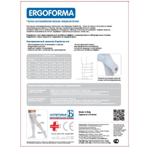 Они выполнены из особого материала, который создает градуированную компрессию (в области лодыжек – 100%, верхней трети голени – 70%, бедренной области – 40%) по всей нижней конечности.
