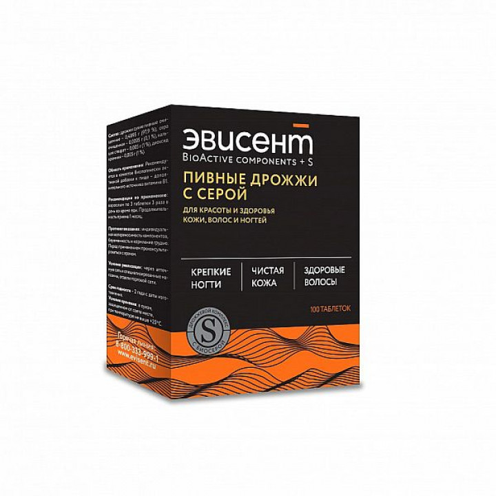 - Пивные дрожжи с серой «Эвисент» незаменимы для молодости, красоты и здоровья кожи, волос и ногтей. Превосходный натуральный комплекс, который восполняет дефицит важнейших витаминов и макроэлементов в организме. Повышенное содержание серы в составе способствует оздоровлению и улучшению состояния проблемной кожи. Пивные дрожжи с серой «Эвисент» замедляют процесс старения, повышают эластичность и упругость кожи, активизируют рост волос и ногтей. Не увеличивают массу тела.