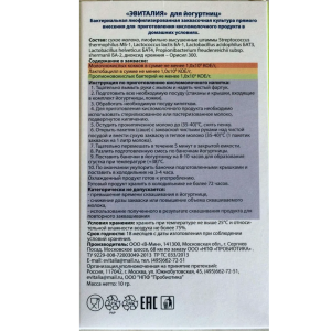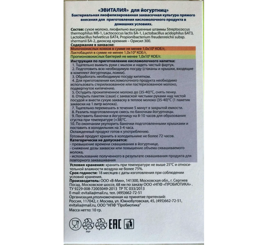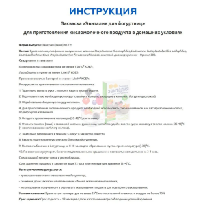 Используя йогуртную закваску "Эвиталия", вы можете быть уверены, что получаемый продукт содержит лишь молоко, обогащенное натуральными витаминами, минералами, полисахаридами, кислотами и другими компонентами необходимыми и полезными для Вашего организма.