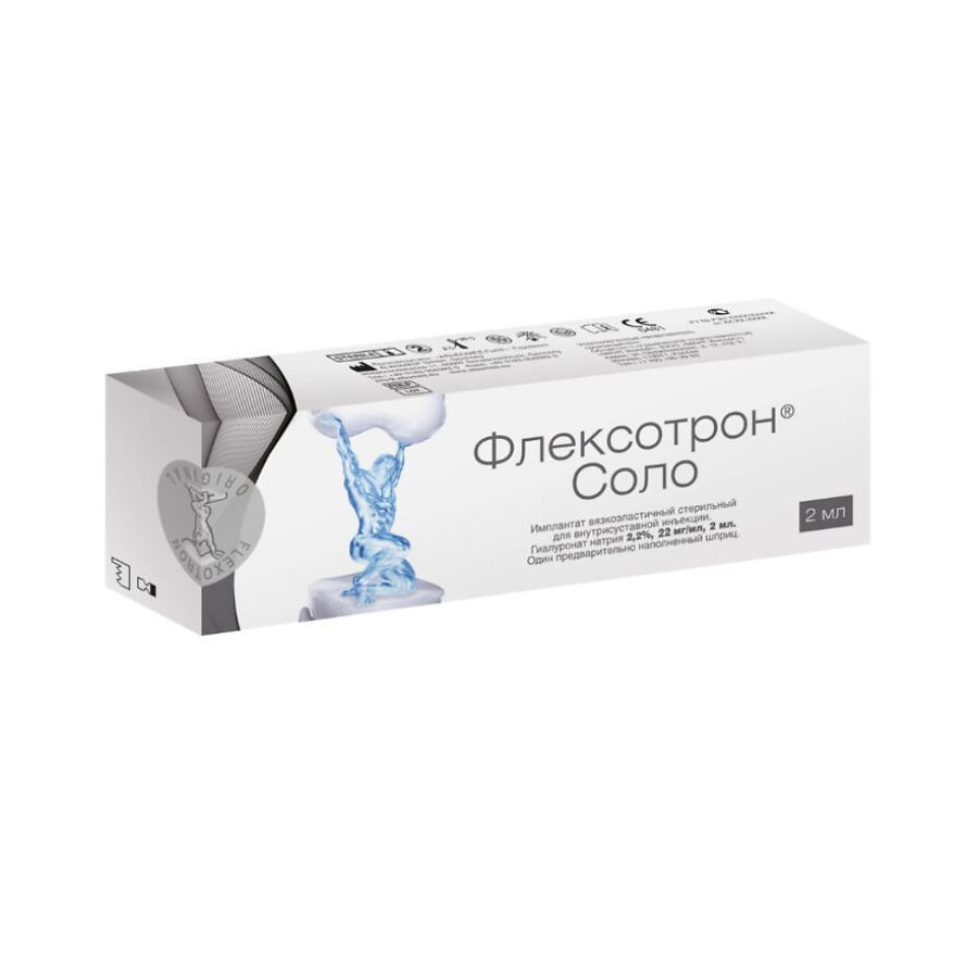 ФЛЕКСОТРОН® Соло – протез синовиальной жидкости, стерильный, прозрачный вязкоэластичный гель, содержащий гиалуронат натрия, получаемый методом бактериальной ферментации, в фосфатном буфере. Имплантат не содержит лекарственного средства для медицинского применения, материалов животного и (или) человеческого происхождения.