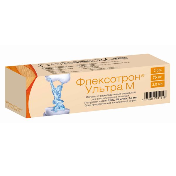 Имплантат вязкоэластичный стерильный для внутрисуставной инъекции ФЛЕКСОТРОН® Ультра М (FLEXOTRON® Ultra М), гиалуронат натрия 2,5 %, 25 мг/мл, 3 мл.