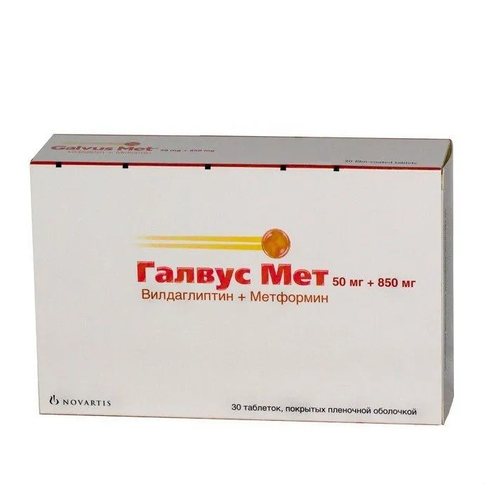 В состав препарата Галвус Мет входят два гипогликемических средства с разными механизмами действия: вилдаглиптин, относящийся к классу ингибиторов дипептидилпептидазы-4 (ДПП-4), и метформин (в форме гидрохлорида), представитель класса бигуанидов. Комбинация этих компонентов позволяет более эффективно контролировать концентрацию глюкозы крови у пациентов с сахарным диабетом 2 типа в течение 24 часов.