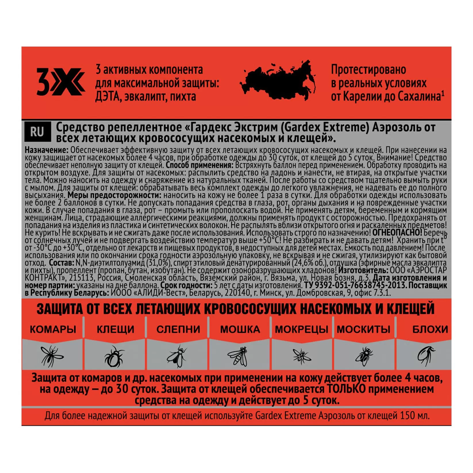 Защищает от всех летающих кровососущих насекомых (комаров, москитов, слепней, мокрецов, мошек, блох), а также от таежных и лесных клещей.