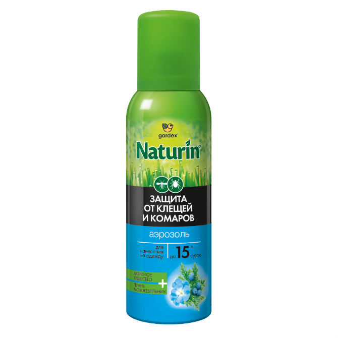 Gardex Naturin аэрозоль - эффективное средство для защиты от комаров и клещей. Защищает от укусов комаров, мокрецов и москитов до 5 суток, от клещей - до 15 суток.