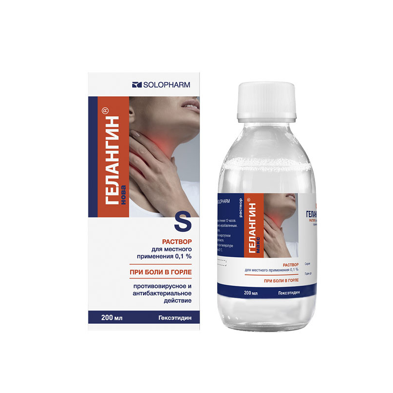 Препарат Гелангин® нова, раствор для местного применения, можно использовать только для полоскания полости рта и гортани. Раствор нельзя проглатывать.