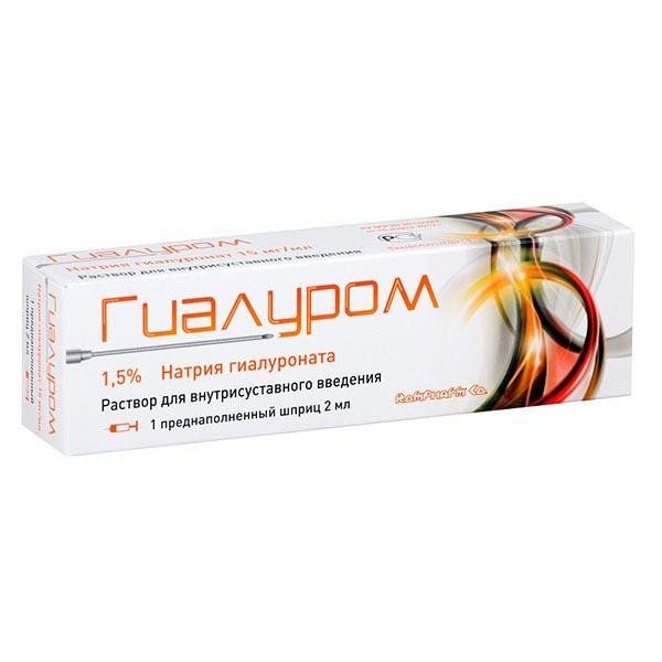 Раствор для внутрисуставного введения ГИАЛУРОМ - 1,5 % раствор натрия гиалуроната в одноразовых шприцах по 2 мл представляет собой стерильный, вязкоэластичный раствор гиалуроната натрия. Гиалуронат натрия получен в результате бактериальной ферментации. Гиалуронат натрия ГИАЛУРОМ представляет собой полисахарид идентичный человеческому, состоит из повторяющихся дисахаридных звеньев Nацетилгликозамина и глюкуроната натрия, с молекулярной массой, превышающей 2 400 000 Да. Натрия гиалуронат присутствует повсеместно в организме человека и присутствует в больших концентрациях в тканях, таких как стекловидное тело, синовиальной жидкости, пуповине и дерме. В синовиальной жидкости гиалуронат натрия выступает как смазка и поглотитель удара, что способствует нормальному движению без боли. При заболевании типа артрита, вязкоупругость синовиальной жидкости снижается, так что значительно увеличивает механическую нагрузку на сустав и усиливается разрушение суставного хряща, проявляется ограничением и болями при движении в суставах. Смазывающее и амортизирующее действие этого препарата смягчают боли и улучшают подвижность сустава при внутрисуставном применении. Данные эффекты продолжаются более 6 месяцев после одного курса лечения.